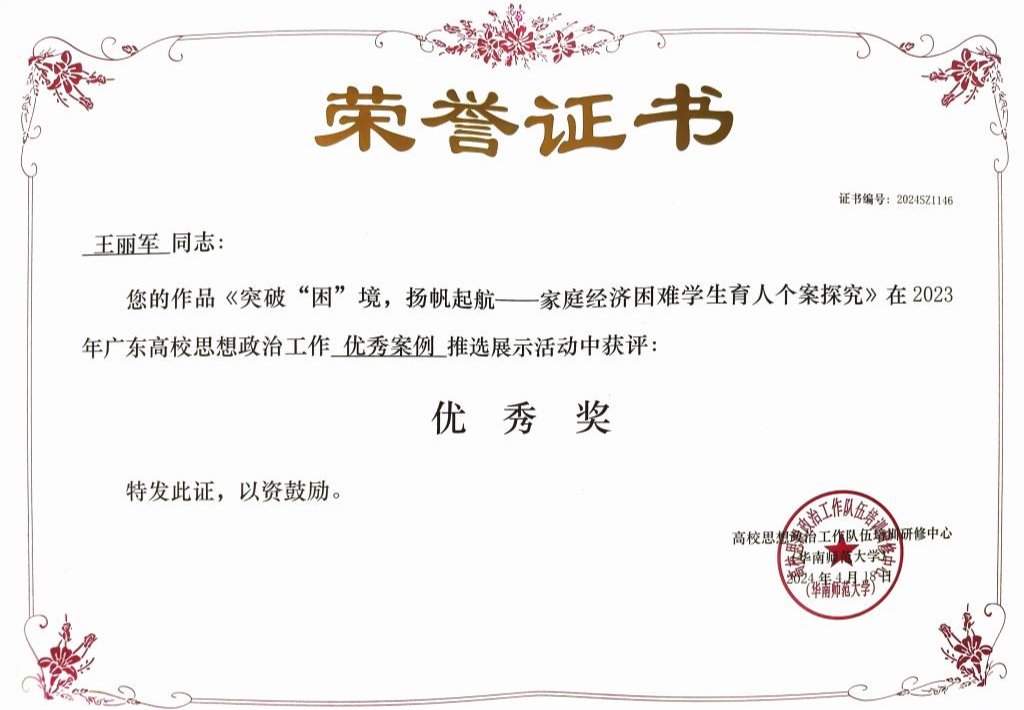 近日,2023年广东高校思想政治工作优秀论文、优秀案例、教学视频以及原创文化精品推选展示活动结果公布。我校推优报送的多项学工队伍优秀作品在本次比赛中获奖。其中,工作案例获奖10篇、工作论文获奖11篇、原创文化精品获奖1首、教学视频获奖2部。