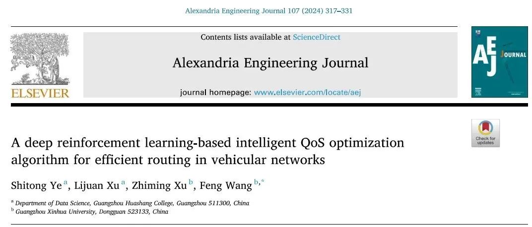 近日,人工智能学院教师叶仕通以第一作者身份在《Alexandria Engineering Journal》期刊发表了题为“A deep reinforcement learning-based intelligent QoS optimization algorithm for efficient routing in vehicular networks”的论文,该期刊属于SCIE检索期刊,是JCR Q1分区,中科院二区,Top期刊。