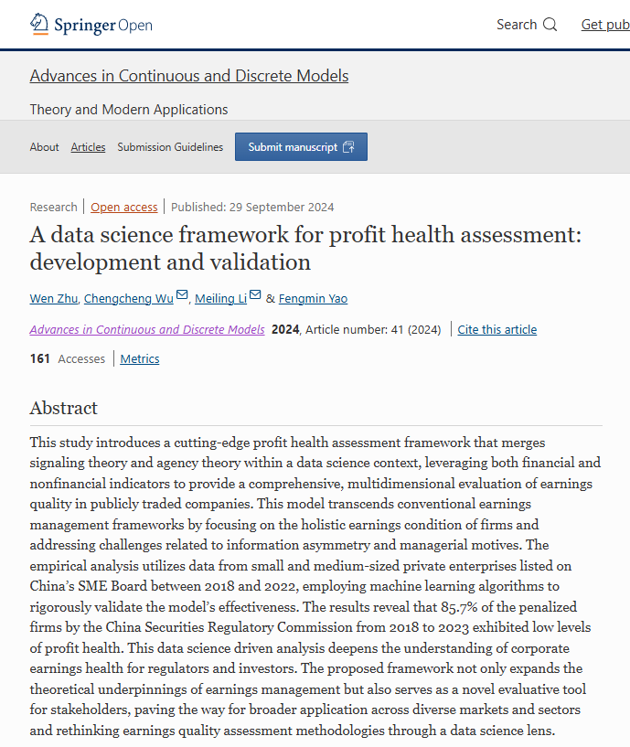 近日,伟德体育会计学院朱文教授团队论文“A data science framework for profit health assessment: development and validation”在施普林格旗下的国际期刊《Advances in Continuous and Discrete Models》上发表。