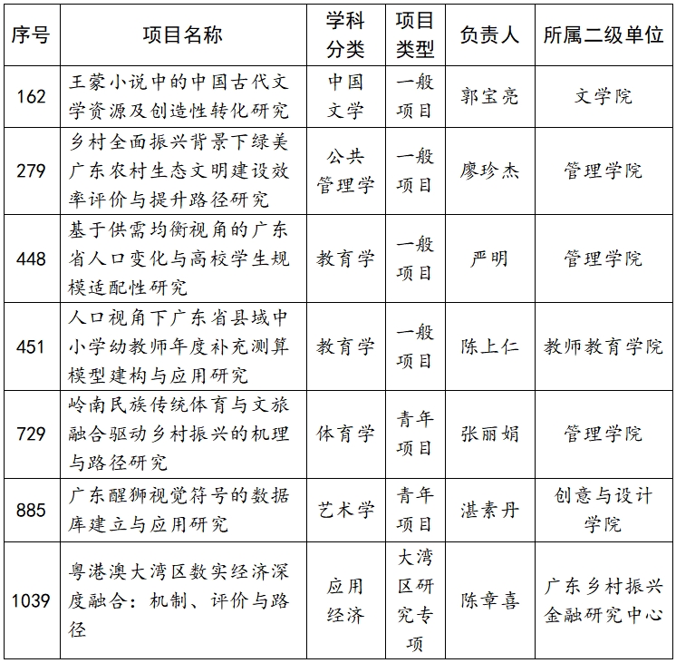 4月25日,广东省社会科学界联合会对广东省哲学社会科学规划2025年度常规项目、三类研究专项拟立项名单予以公示,共1109项予以公示,我校有7项位列其中,名单如下: