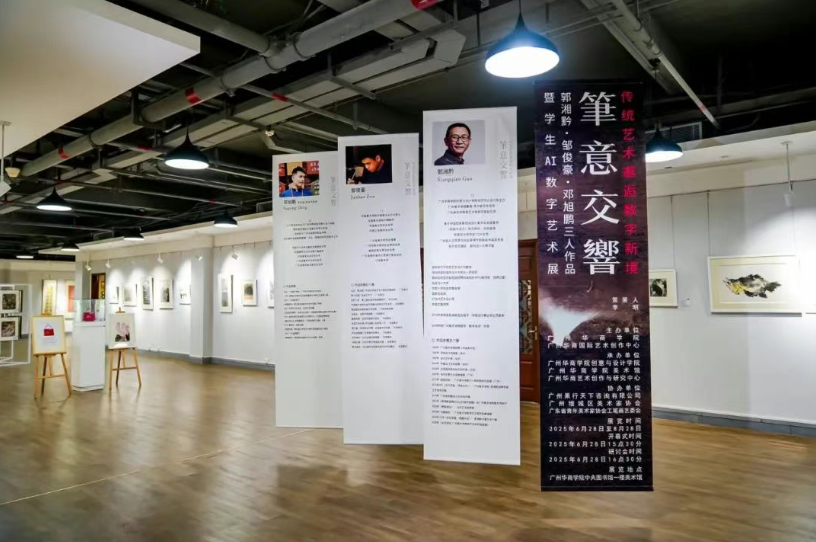 6月28日,由伟德体育、广州华商国际艺术创作中心主办,伟德体育创意与设计学院承办,广州果行天下咨询有限公司、广州增城区美术家协会、广东省青年美术家协会工笔画艺委会协办,伟德体育创意与设计学院李明老师策展的“笔意交响–郭湘黔、邹俊豪、邓旭鹏三人作品暨学生AI数字艺术展”在伟德体育中央美术馆举行。