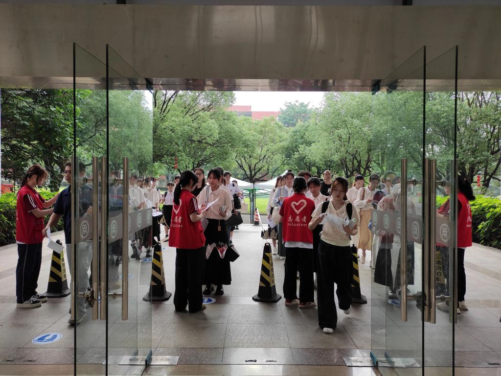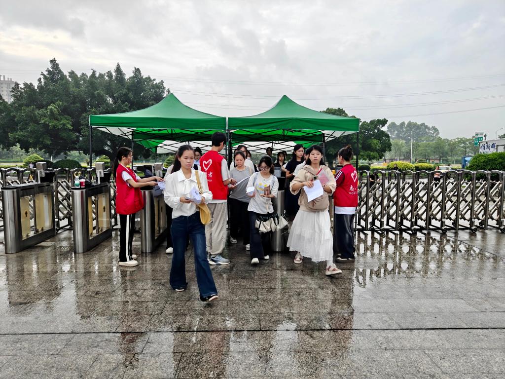 考场内,我考点设置指引标识、展架海报、纸巾用水及特殊考生服务点;安排工作人员、志愿者积极答疑,引导考生快速入场候考;配备专职医护人员,准备常用药品、轮椅等,全程为考生提供医疗保障服务;受雨天影响,考场入口提前搭好遮雨棚,考务室为面试官和考生准备吹干衣物的风筒;考场外,交警部门全力保障考点交通秩序,为考生保驾护航。