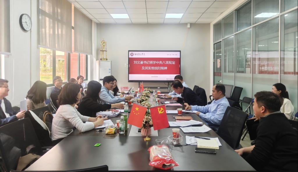 会议伊始,广东财经大学财政税务学院党委书记刘文基带头领学中央八项规定及其实施细则精神。他详细阐述了中央八项规定出台的背景、意义及实施以来的成效,并对实施细则的各项要求逐一解读。刘文基书记强调,党风廉政建设是党的建设的重要组成部分,是保持党的先进性和纯洁性的重要保障。他提议,与会党员要时刻保持清醒头脑,严守党的纪律规矩,做到廉洁自律、勤政为民,为党和人民的事业贡献自己的力量。