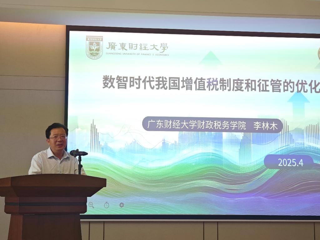 随后,研讨会进入主旨分享环节。广东财经大学财政税务学院院长李林木教授分享“数智时代我国增值税制度和征管的优化”。新《增值税法》已于2024年年底颁布,于2026年起正式施行。在此背景下,李林木教授分享了他对优化我国现行增值税税制的研究,结合OECD成员国的经验,从纳税人身份定义、征税对象范围、税率设置、计税方法、税收优惠、征收管理等六个维度剖析了优化税制的角度和方向,为高校财税教学与增值税的税制研究提供了宝贵的经验参考。
