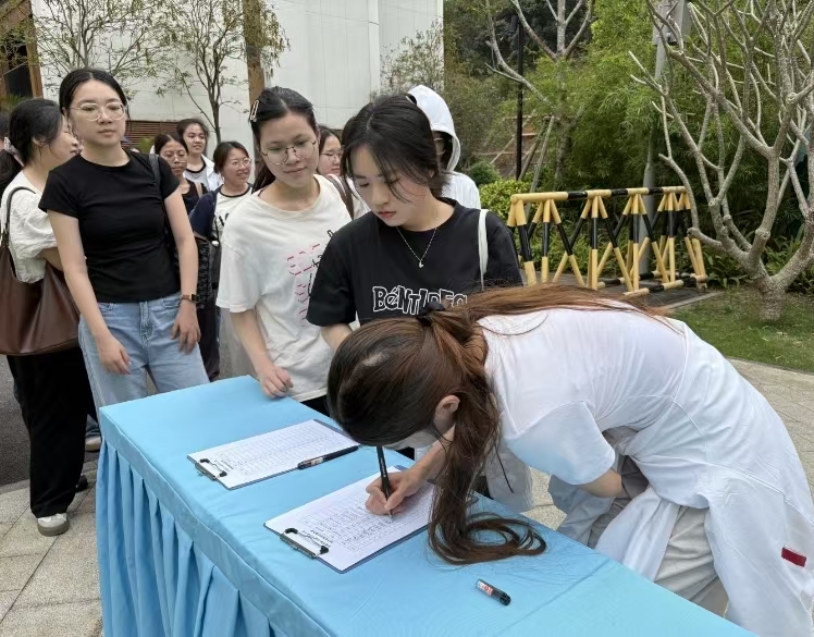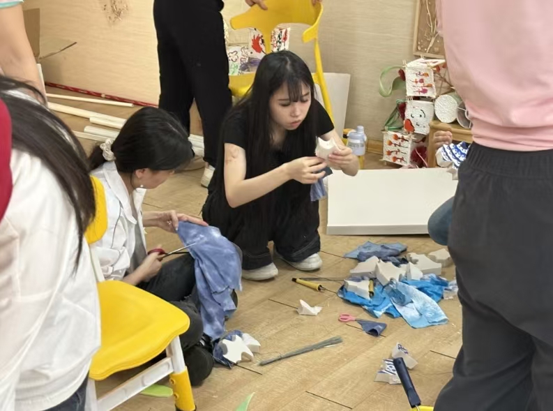 在入园后的见面会上,周园长向同学们介绍了该幼儿园“尊重生命,以人为本”的办园理念。同学们迅速组队,投入了幼儿园环境创设的工作中。一班的学生制作扎染作品,他们表示,这样的实践课程非常有意义,既帮助深入了解幼儿园环创的过程与意义,又能够学到一项新的技能,丰富自己的生活。二班则是用彩色纸板和扭扭棒装饰一只漂亮的立体“孔雀”。环创体验结束后,学生们手持《学前儿童科学教育》中的观察量表开始了课程观察,观摩真实的幼儿园科学活动开展情况。