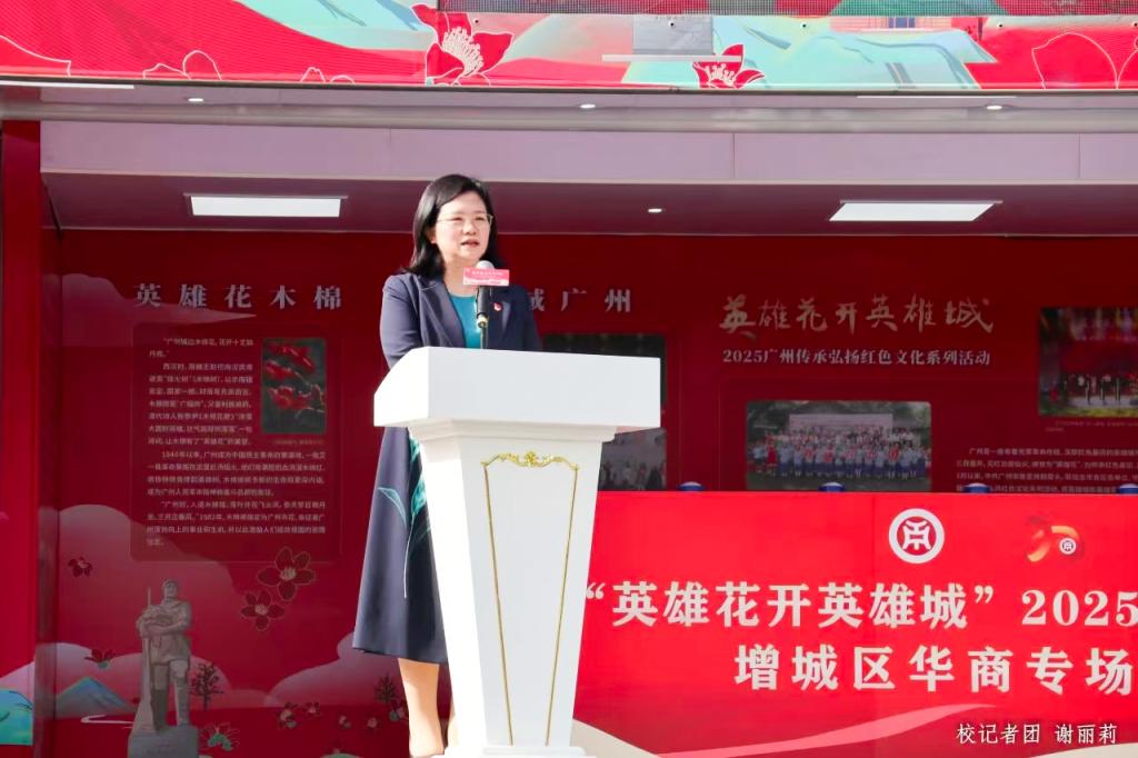 广州市委宣传部、增城区委宣传部、增城区委党史研究室、增城区教育局、增城区文联、伟德体育、荔湖街道办等有关单位的领导嘉宾及我校广州校区500多名师生共同见证巡展活动“英雄旗”授旗仪式。旗帜在市区两级领导手中庄严挥舞传递,象征着“赏英雄花、游英雄城、传英雄志、弘英雄气”的红色使命在增城、在华商落地生根。