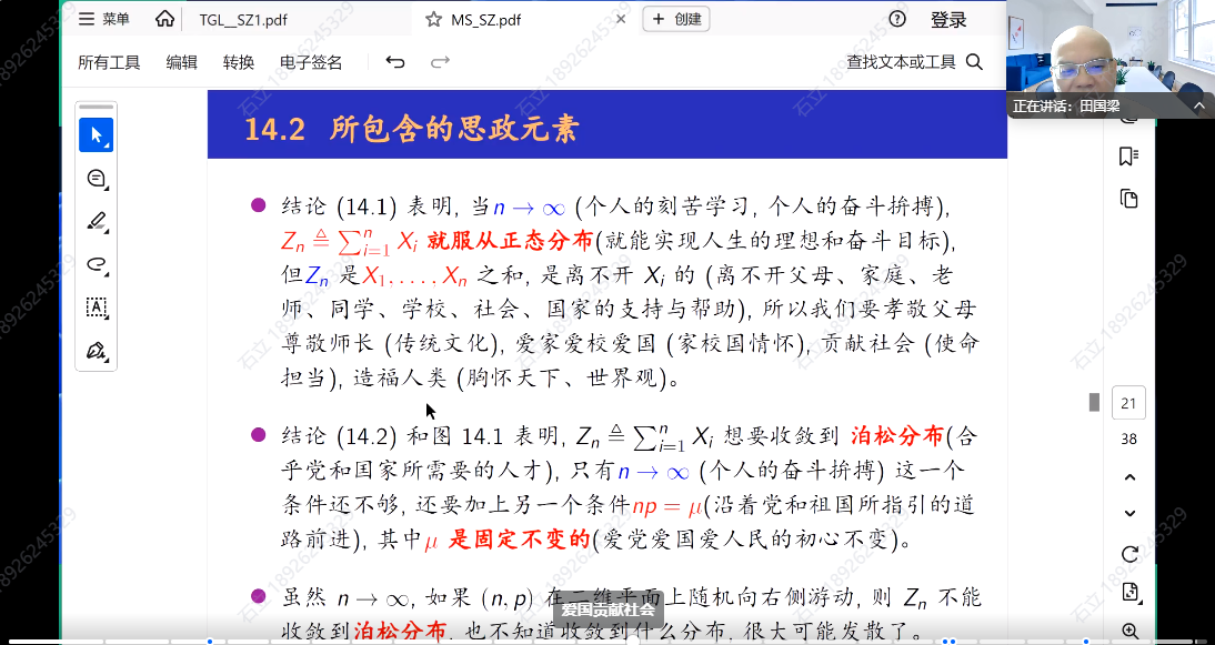 随后,田国梁教授作了主题为“《数理统计》课程思政的教与学”的报告,田教授介绍了其总结的两德、唯物辩证法三部分、四学术、四个自信、五科学、六观、七个思维、八类中国精神、九个意识、十个能力等十大类常用思政元素,分享了其在本科《数理统计》课程思政的教与学六讲:South与Southern之区别、指数分布与几何分布的无记忆性、深度理解中心极限定理、二项分布的正态近似和泊松近似、从矩估计量到Monte Carlo积分、三参数 Student’s t-分布及其推广,这些内容深度结合数理统计的专业知识,巧妙地融合了思政元素,激发学生的爱国爱校爱家的热情,以及敢于科学探索的精神。报告持续了近两个小时,报告内容丰富、资料详实、课程思政设计巧妙,老师们纷纷表示受益匪浅。