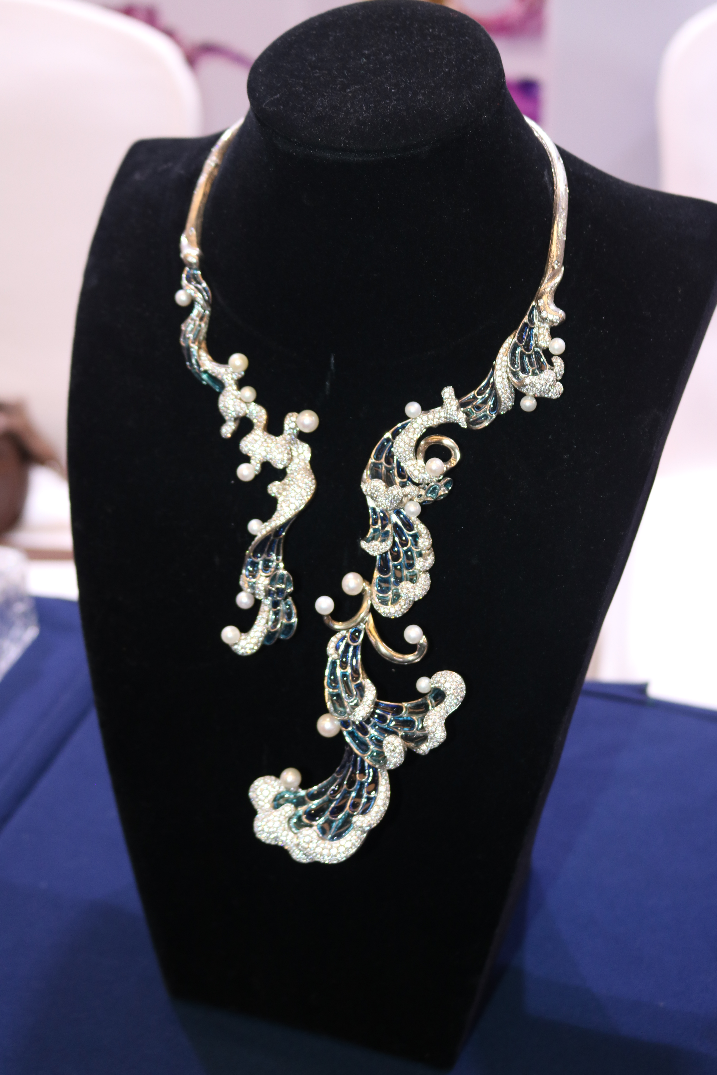 踏入展会现场,师生们仿佛步入一个绚丽多彩的时尚奇幻空间。参展商依据11个品类有序布局,各自绽放独特魅力。国潮新中式风格的饰品尽显典雅古韵,设计师重工打造的作品展现精湛工艺;时尚珍珠款散发优雅气质,莫桑与培育彩宝豪镶款尽显奢华璀璨。