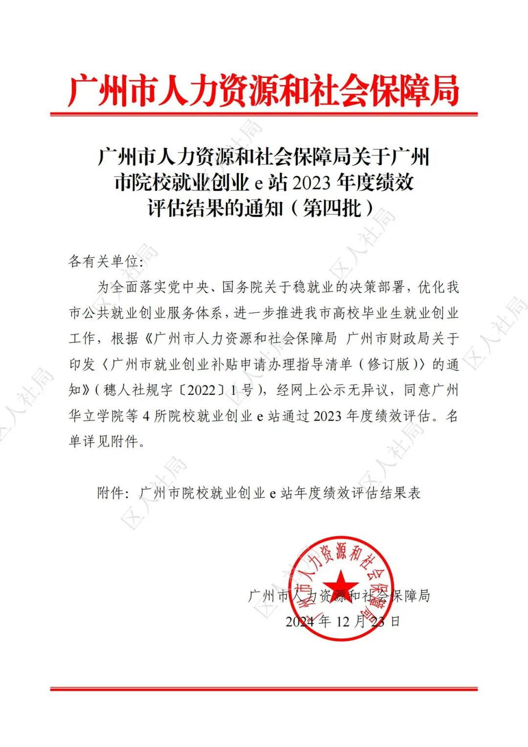 2024年12月23日,根据《广州市人力资源和社会保障局 广州市财政局关于印发〈广州市就业创业补贴申请办理指导清单(修订版)〉的通知》(穗人社规字〔2022〕1号),经网上公示无异议,同意伟德体育就业创业e站通过2023年度绩效评估。