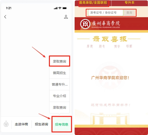 考生可通过学校官方微信公众号查询,具体路径为点击【校园生活】-【录取查询】-【普高录取/全国联招】,输入个人信息即可查询;也可通过招生办官方微信公众号查询,点击【招考信息】-【录取查询】-【普高录取/全国联招】,输入个人信息完成查询;还可登录学校招生信息网(http://zs.gdhsc.edu.cn/),进入首页后点击【录取/成绩信息查询】,输入个人信息完成查询。