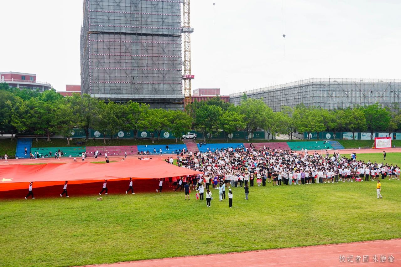 “五星红旗迎风飘扬,胜利歌声多么嘹亮”国旗方队飒爽英姿,75位志愿者稳稳高举巨幅国旗,600平方米的巨幅国旗从2500余名师生头顶掠过,象征着华商人“强国一代有我在”的赤子情怀,在进一步全面深化改革、推进中国式现代化的征程中彰显青春风采,贡献华商力量。此时此刻,生在国旗下、长在新中国被具象化。阳光透过国旗,撒下一地赤诚,抬头便是中国红。