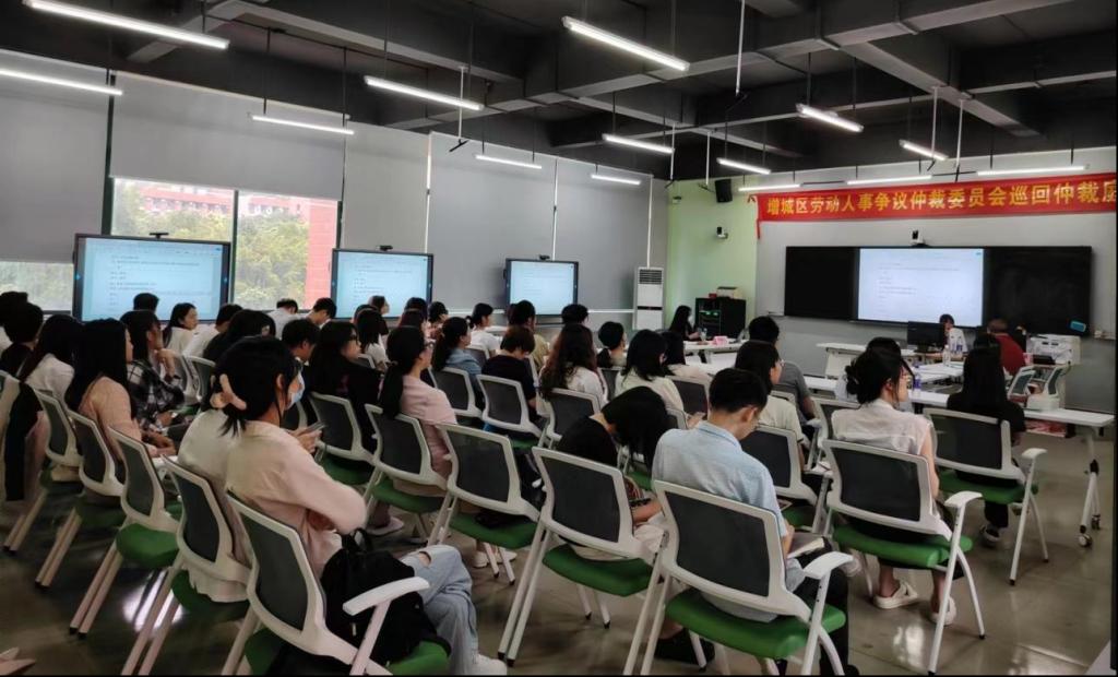 随着仲裁员、书记员、申请人、被申请人准备就绪,巡回仲裁庭首案正式开庭。来自校外企业方、华商教育集团、伟德体育、广州华商职业学院及广东华商技工学校的人事、法务岗人员及人力资源相关专业师生代表逾50人到场观摩学习。庭审现场座无虚席,井然有序。