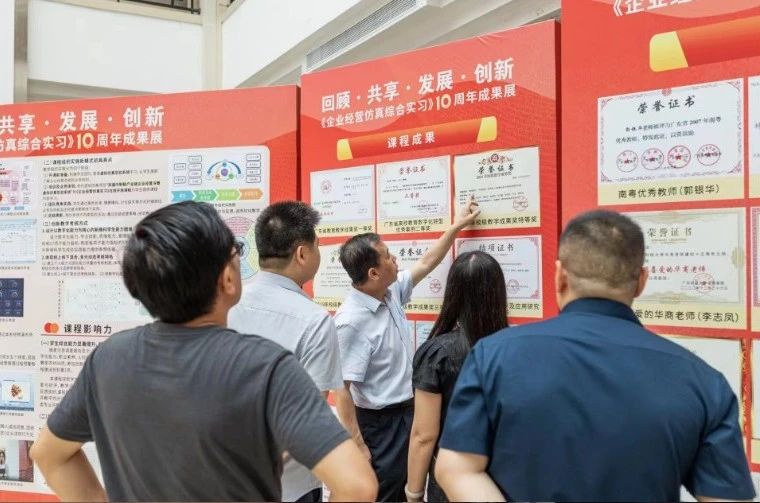 在董事长和校领导的关心和支持下,课程取得了广东省教学成果奖一等奖、广东省线下一流本科课程等一系列可喜成绩。展览的现场,一系列丰富多样的展板陈列在图书馆大厅,内容丰富,形式多样,全面回顾《企业经营仿真综合实习》10年的发展历程、教学理念和数字化教学取得的创新成果。