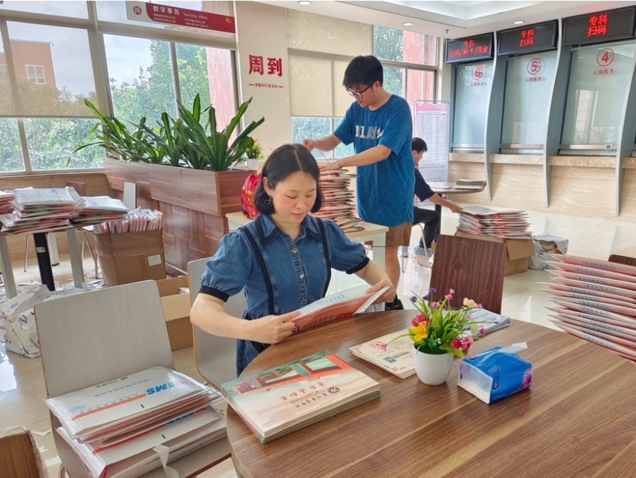 这份通知书里饱含着华商对你们的期待,也承载着你们对未来的无限向往。为了让同学们尽快收到通知书,工作人员加班加点核对数据、打印通知书、封装通知书等。下面跟随官微君的脚步,一起直击录取通知书装封现场。