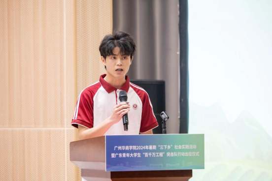 广东青年大学生“百千万工程”突击队“惠韵乡创”社会实践服务队队长李钦鹏发言。他代表即将出征的同学们郑重承诺,将珍惜本次实践机会,听从组织安排,树牢安全意识,把理论知识应用于实践,将所学的知识转化为服务人民的具体行动。在实践中,争当突击队,勇做生力军,立志做有理想、敢担当、能吃苦、肯奋斗的新时代好青年,以谦虚的态度学习,以真诚的心服务奉献乡村。