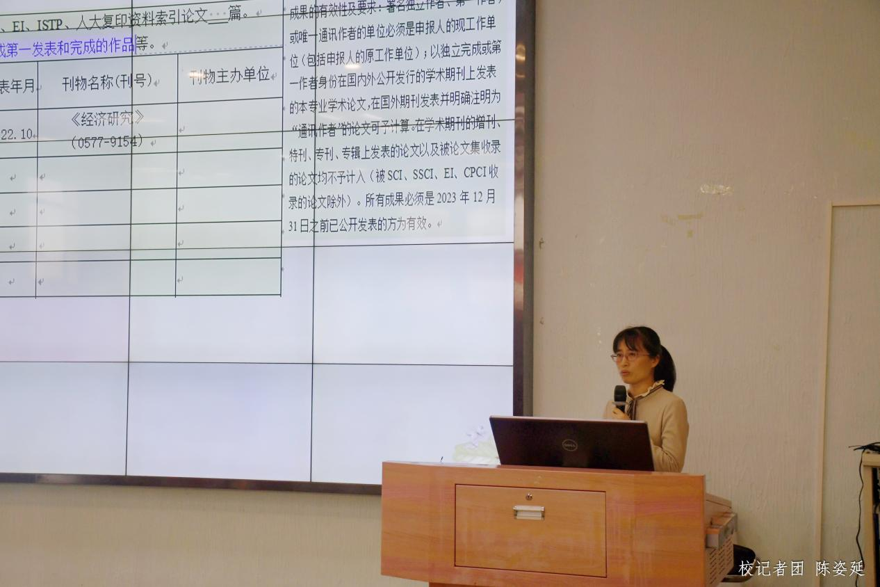 申报事项讲解环节,人事处旷美容、教务处陶丹艳、科研处孔海兰三位工作人员分别从基本信息、教学业绩情况、科研业绩情况等方面,通过举例说明、填写演示、案例展示等方式,对2023年职称申报材料填写要求及注意事项进行了详细讲解,帮助申报职称的教师进一步明晰申报要求,规范申报材料的填写,为顺利完成职称申报工作做充足的准备。