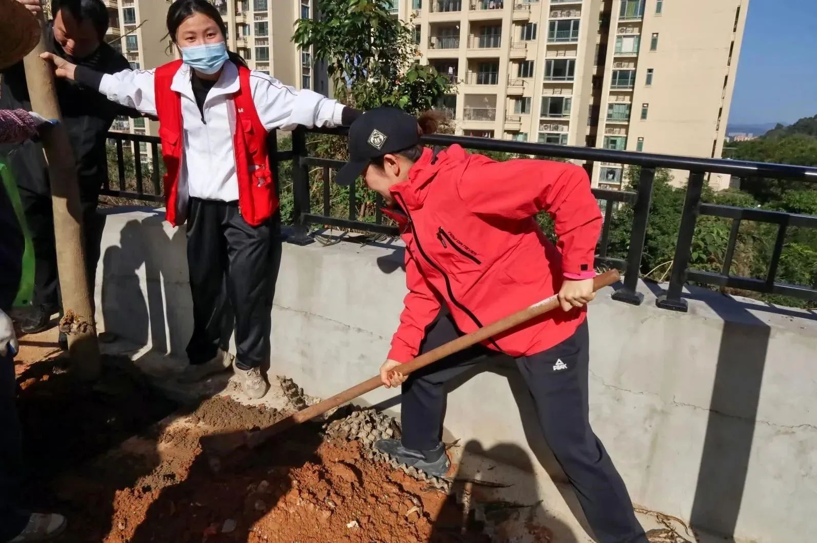 植树现场,华商师生挥锹铲土、扶苗培土、围堰浇水,经过一个多小时的努力,合力种下紫花风铃树苗和四季桂树苗。新种下的树苗迎风挺立,在春意盎然的华商校园里焕发无限生机。