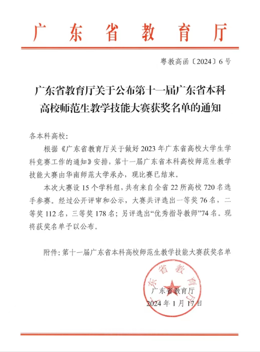 近日,由广东省教育厅主办、华南师范大学承办的第十一届广东省本科高校师范生教学技能大赛(小学教育组)决赛在华南师范大学石牌校区举行。经过校内初赛(2022-2023学年第一学期小学教育专业2021级师范生教师职业能力大赛)推选和省赛组委会初选后,教师教育学院两名参赛选手:朱琳(指导教师:潘昕迪、魏林苹)和程琳(指导教师:赵中宝)代表学校入围决赛圈,并获得三等奖的好成绩。