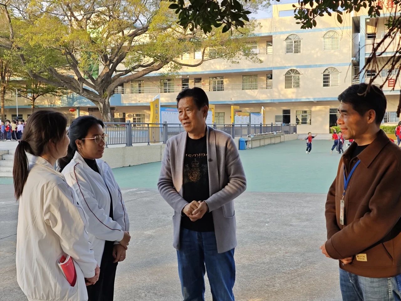 12月5日,为进一步了解小学教育专业见习学生的教学情况,切实关心和帮助教师教育学院见习学生成长成才,伟德体育教师教育学院院长王金道教授、副院长谭建生教授、张博教授、学院党总支副书记许娜同志与年级副主任江庆基老师一行来到四会市东城街道黄岗小学走访交流。