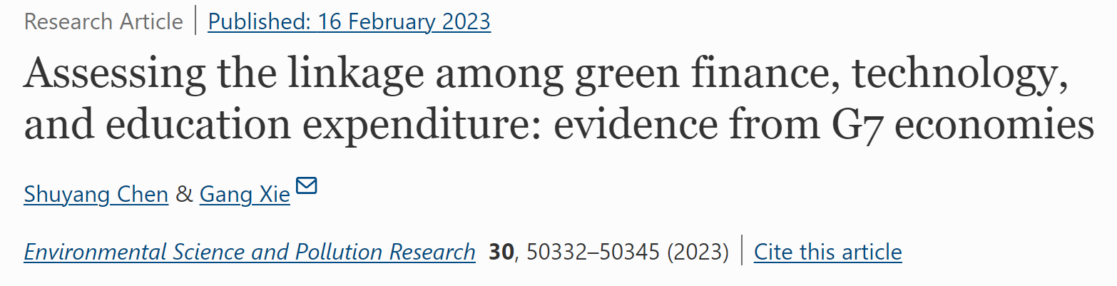 近日,会计学院青年教师陈淑扬以第一作者身份在《Environmental Science and Pollution Research》期刊发表了题为“Assessing the linkage among green fnance, technology,and education expenditure: evidence from G7 economies”的论文,该期刊属于SCIE检索期刊,是JCR Q1分区,中科院3区期刊。