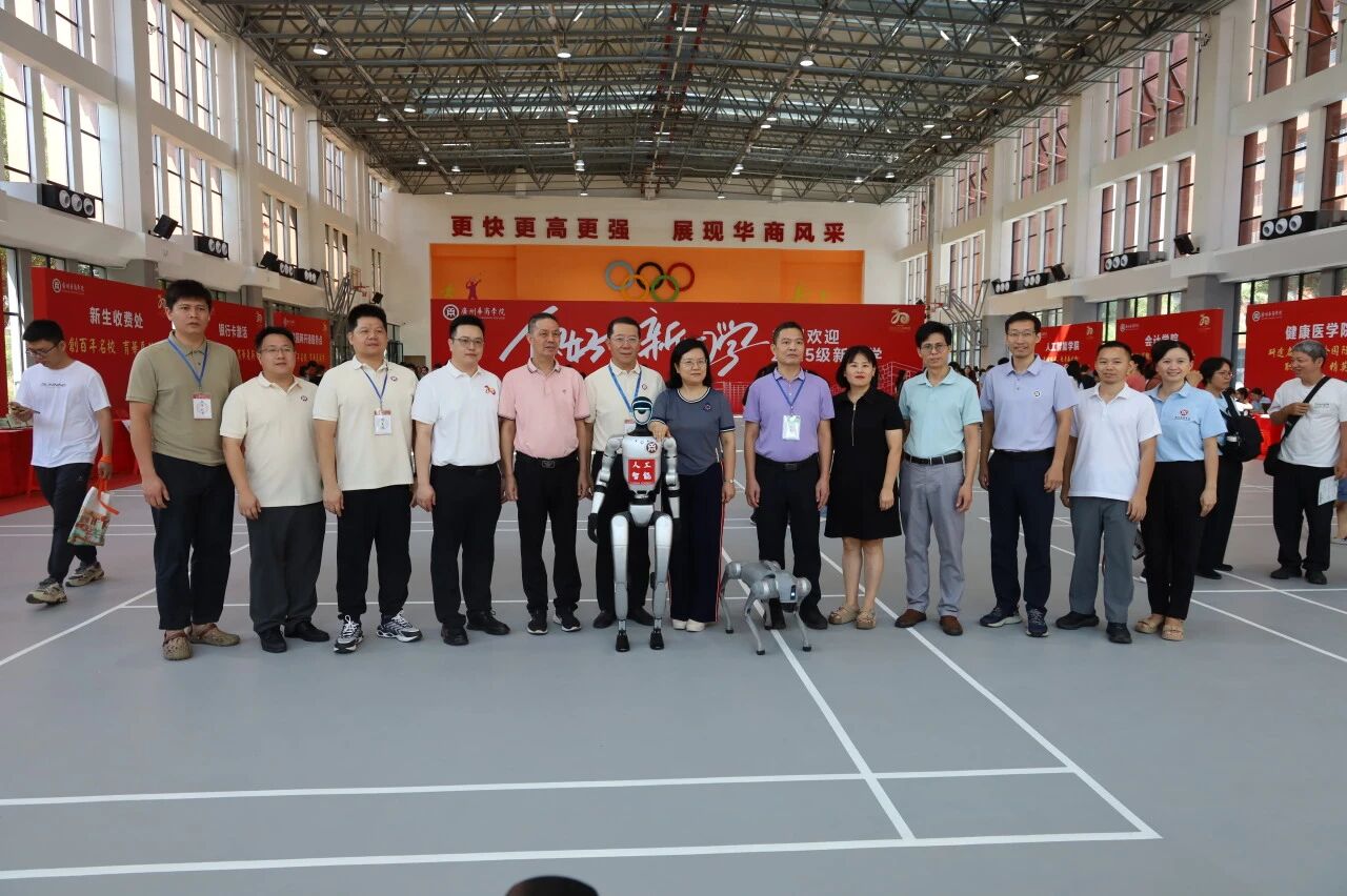 智能机器人身姿挺拔,机器狗灵动活泼,它们仿佛是训练有素的礼仪使者,当新生们踏入场地,机器人就会伸出机械手臂,与新生们一一握手,机器狗则同样用它那独特的“狗式握手”送上问候。它们还能精准地完成各种指令,与新生们并肩同行,用行动表达着对新同学的欢迎。