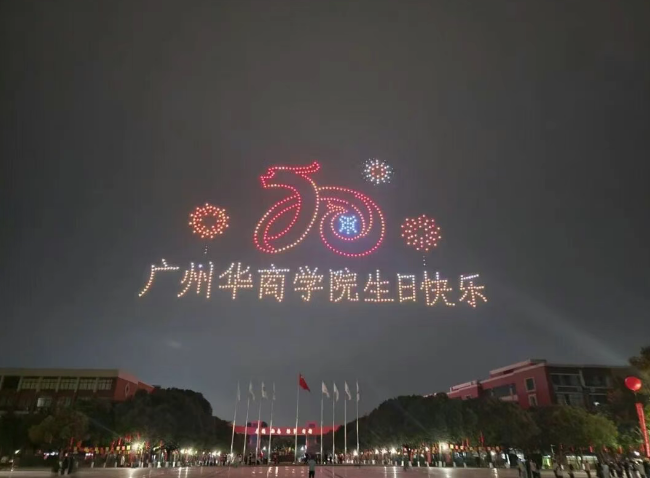 夜幕降临,在广州校区中央图书馆操场上,无人机表演惊艳亮相!1000架无人机在空中编队飞行,以《二十正青春 华商向未来》为主题,从创校之光、立校之魂、育人之基、奋进之路、攀登之梯、美育之果、拥抱之姿、笃行之力、办学之魂等字样与图案,灯光在夜空中勾勒出母校的发展轨迹与美好愿景,引得现场掌声雷动、尖叫不断,将活动氛围推向高潮。