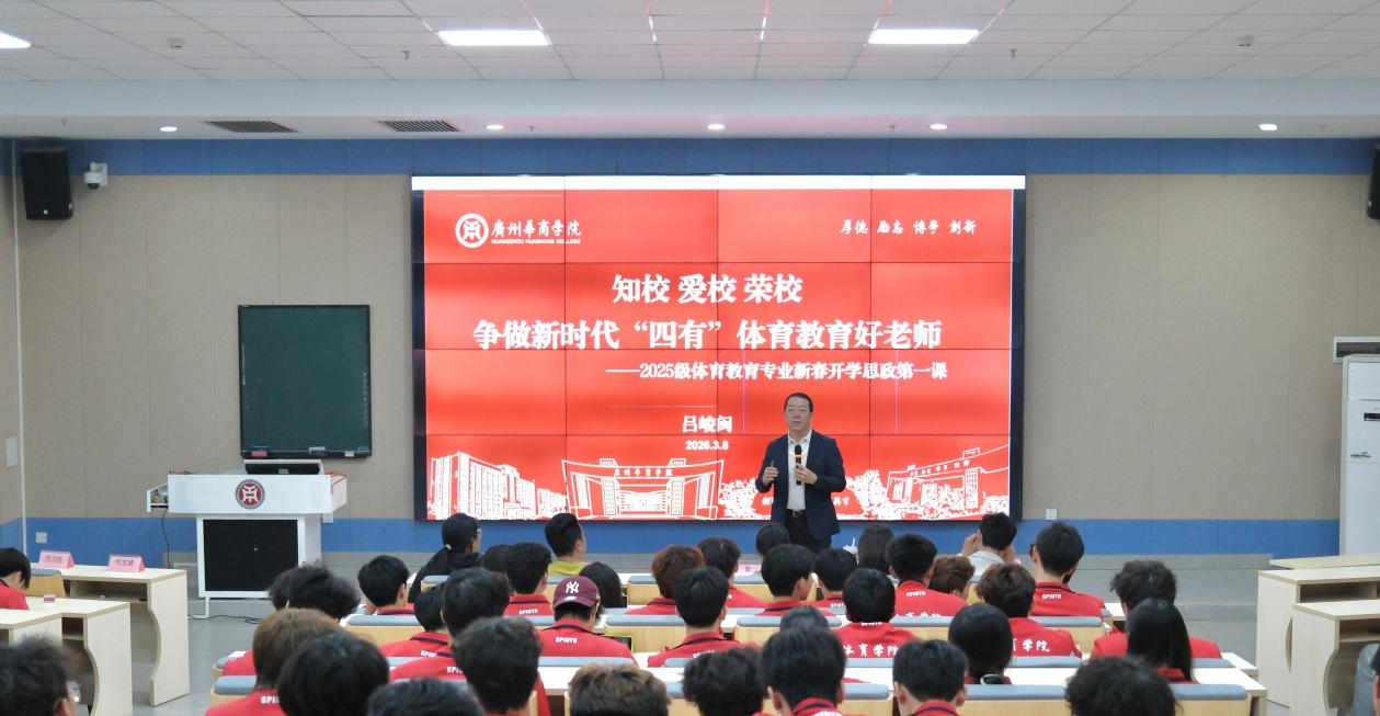 2026年3月8日晚上,伟德体育党委副书记、纪委书记、副校长吕峻闽教授2025级体育教育(师范)专业全体学生讲授新春思政第一课。肇庆校区管委会主任、校长助理覃少冰,体育学院党总支副书记莫军,班主任陈佳琦、温小龙、代文婕,专任教师李健瑜,行政教辅符方哲等教师到场聆听。本次课程在校歌《共铸荣光》的优美旋律中拉开帷幕。