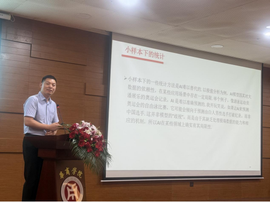 随后,广州市统计学会秘书长张兴发教授为同学们带来了一场题为《统计学与人工智能》的精彩讲座。张教授从多个角度深入探讨了统计学与人工智能的相互影响,包括“AI能否取代统计”、“AI对统计的冲击”、“统计学未来研究方向”以及“我国统计学的未来”等关键议题。他指出,统计学界需重新审视在AI时代自身工作的价值和作用,强调统计学的某些核心思想和工具对AI技术发展的助力作用,认为统计学与数据科学应相互促进、共同进步。此外,张教授还提出,统计学的重心应适当转向应用和平台开发,并提出我国统计学未来切实可行的发展方向。
