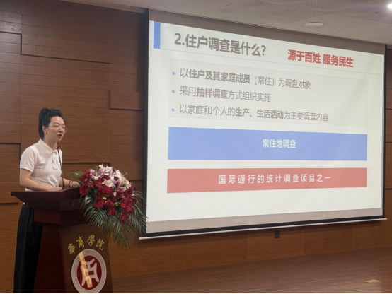 随后,国家统计局增城调查队的周斯琪科长为同学们带来了一场主题为《美好生活,账量多彩民生》的分享讲座。周科长详细阐述了住户调查的定义、发展历程、实际操作流程、数据来源及其重要作用,使同学们对住户调查有了全面而深入的了解。