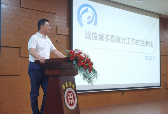 随后,国家统计局增城调查队吴伟江队长为同学们开展了主题为《诚信诚实、依法统计》的讲座。吴队长从“习近平总书记关于统计是诚信、诚实的职业的重要指示批示精神”开始,介绍了《中华人民共和国统计法》最新修订情况,并阐述了统计造假行为已被纳入《中国共产党纪律处分条例》的严肃性,向同学们强调了诚信诚实是统计工作的生命线的重要性。吴队长强调,诚信与诚实是统计工作的核心价值所在。