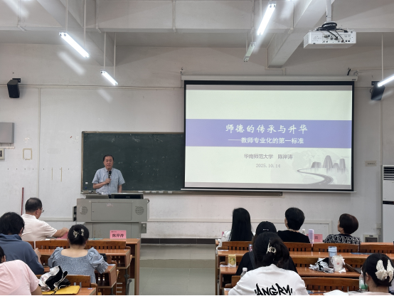 华南师范大学陈岸涛教授受邀担任主讲嘉宾,作了题为《师德的传承与升华——教师专业化的第一标准》的专题报告。陈教授从国家战略与教育现代化进程出发,详细剖析了当前高等教育所面临的多重机遇与挑战,包括产业升级、技术变革与社会转型对教师角色提出的新要求。他结合《中共中央国务院关于弘扬教育家精神加强新时代高素质专业化教师队伍建设的意见》精神,指出师德是教师素质评价的首要标准,必须贯穿于教师职业发展的各环节。报告中,陈教授还援引多位教育界先进人物的感人事迹,生动诠释了“四有”好老师的内涵,鼓励教师们通过持续学习与反思,不断提升道德境界与专业能力。最后,陈教授以《怎样培养真正的人》等书籍推荐作结,勉励全体教师不断提升自身师德修养,努力成为学生成长道路上的引路人。