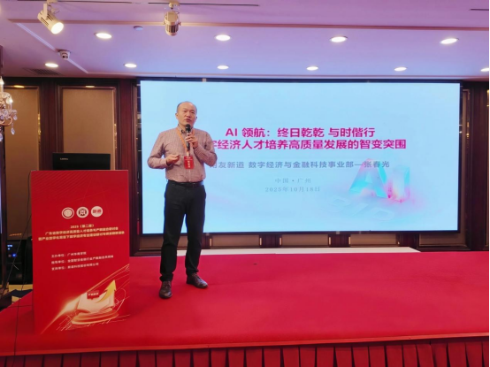 新道科技股份有限公司数字经济与金融科技事业部总经理张春光,以“数字经济人才培养高质量发展的智变突围”为主题,从数字经济人才培养全生命周期路径出发,探讨了企业数字化、AI应用、数字经济内涵及人才培养路径等关键内容。