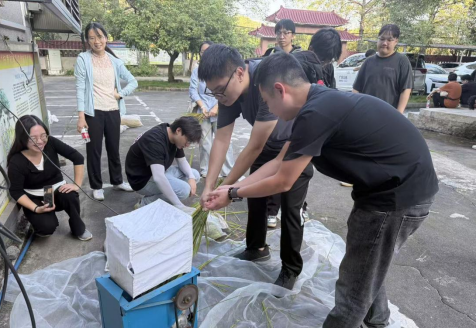 实地采样活动中,调查队工作人员讲解划定标准样本方区、精准收割固定面积稻谷、记录穗数与千粒重参数等规范流程。讲解结束后,学生们踏入稻田,在专业人员指导下分组开展实践,并收割后的稻谷运送至集中点进行脱粒称重。
