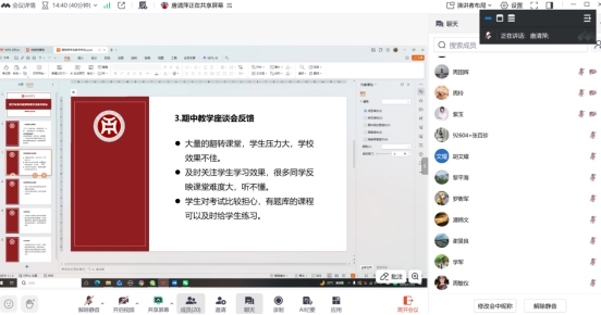 结合期中教学座谈会收集的意见,会议重点讨论了当前教学中的突出问题。针对学生反映的翻转课堂压力大、部分课程难度偏高、课堂内容聚焦不足等情况,明确教师需及时关注学生学习效果,合理调整教学节奏与内容密度。对于有题库的课程,将尽快向学生开放练习资源,缓解考试焦虑;同时重新审视分组作业设计,防范 “搭便车” 现象,确保学习效果落地。