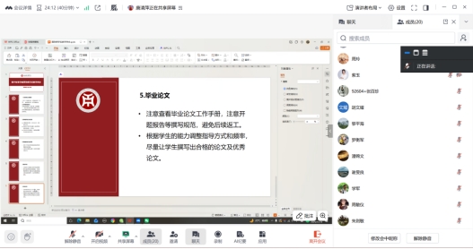 会议对期末考核工作作出具体部署。教师需按时提交过程性考核备案表,出题环节要严格把握难度尺度,多名教师共用试题需提前沟通明确范围,确保试题规范、参考答案合理,以公平公正的考核方式检验教学成效。围绕毕业论文工作,会议要求教师严格参照工作手册规范,重点把控开题报告等关键环节,避免后续返工。需根据学生个人能力差异,灵活调整指导方式与频率,助力学生撰写出合格乃至优秀的毕业论文,切实提升人才培养质量。