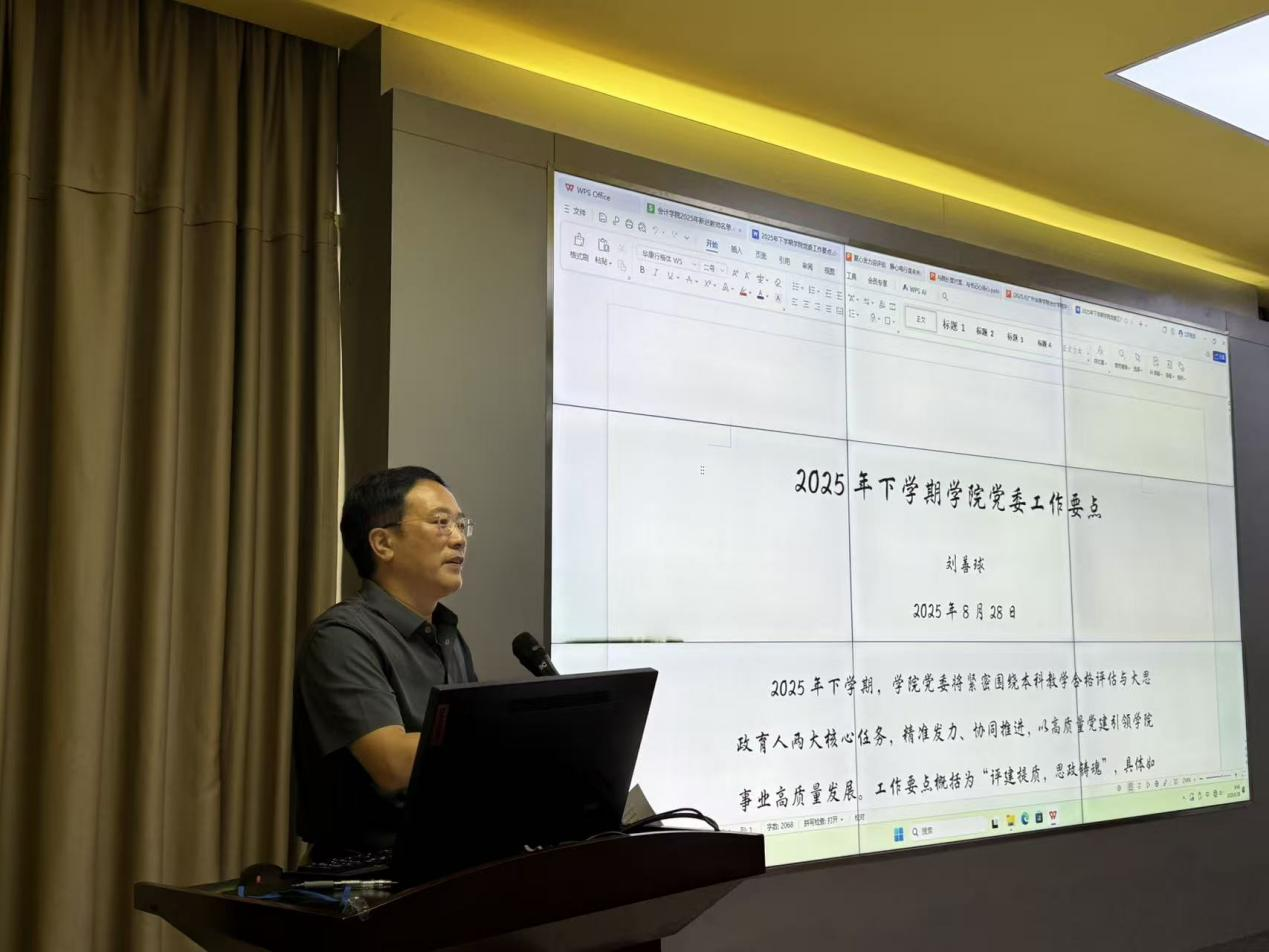 学院党委书记刘善球围绕“评建提质,思政铸魂”明确党委工作要点,核心聚焦本科教学工作合格评估与大思政育人两大任务:评估工作上,通过强化思想引领、深化理论武装、压实党员岗位责任,以党建引领评建,推动全员参与;大思政育人方面,从课程融合、教材案例库建设、辅导员职能强化、“行走的思政课堂”实践、数字赋能及“一站式”管理体系多维度创新;同时,他从教师课堂行为规范、学生课堂要求及专项巡查机制入手,强调要强化教风学风建设,并加强流动党员管理,发挥其先锋作用。