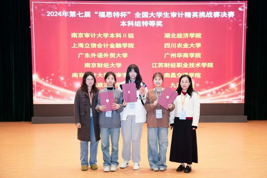 2024年11月30日,第七届“福思特杯”全国大学生审计精英挑战赛在南京审计大学圆满落幕。经过初赛、复赛、决赛的激烈角逐,我校会计学院审计系马玉娟老师、张丽老师、彭司晨老师指导的2022级本科生苏琳雁、甘悦茹、黄锦贤获得本科生组特等奖。