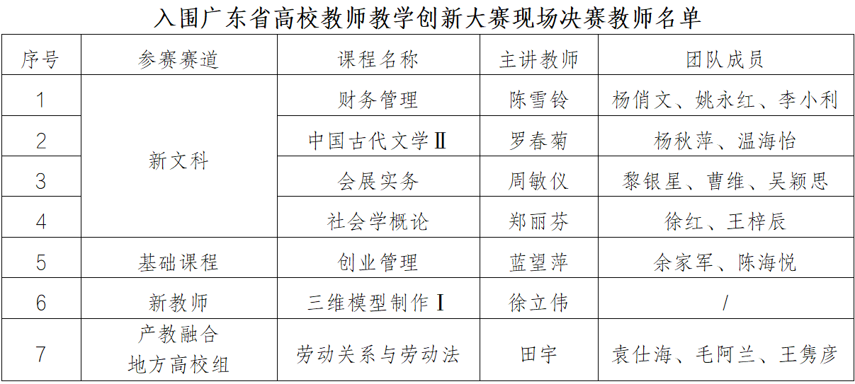 近日,广东省高等教育学会公布第六届全国高校教师教学创新大赛广东分赛暨广东省高校教师教学创新大赛现场决赛拟入围名单。我校陈雪铃、罗春菊、周敏仪、郑丽芬、蓝望萍、徐立伟、田宇7位教师(团队)成功入围省赛决赛,入围数量位居省内民办高校第二,创下我校历年来最好成绩。