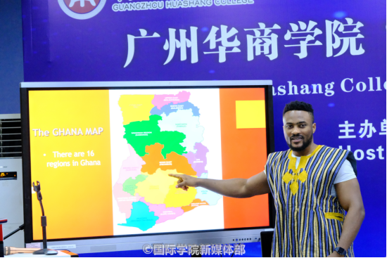 开幕式后,举办了加纳历史文化分享会,加纳籍外教Frank Larbi通过介绍加纳历史、文化、风俗、特产、教育、艺术,让在场的观众享受了一场文化盛宴,期间还穿插了歌舞表演、加纳特产有奖问答、非洲鼓打击技巧、学跳非洲舞蹈等内容,整场互动欢快、热烈,笑声欢呼声此起彼伏。最后,与会人员还品尝了加纳传统美食和饮品。