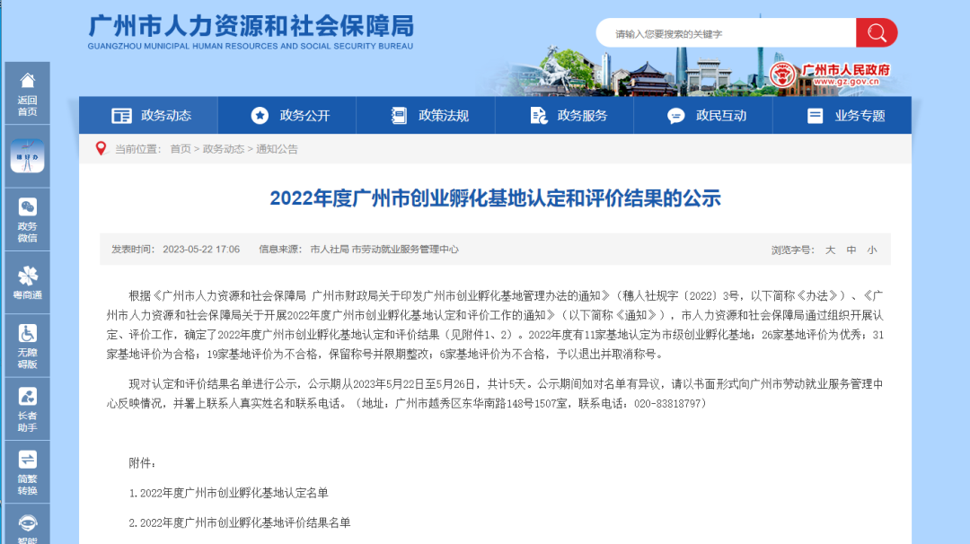 近日,根据广州市人力资源和社会保障局《2022年度广州市创业孵化基地认定和评价结果的公示》,华商众创孵化基地成功被认定为市级创业孵化基地。
