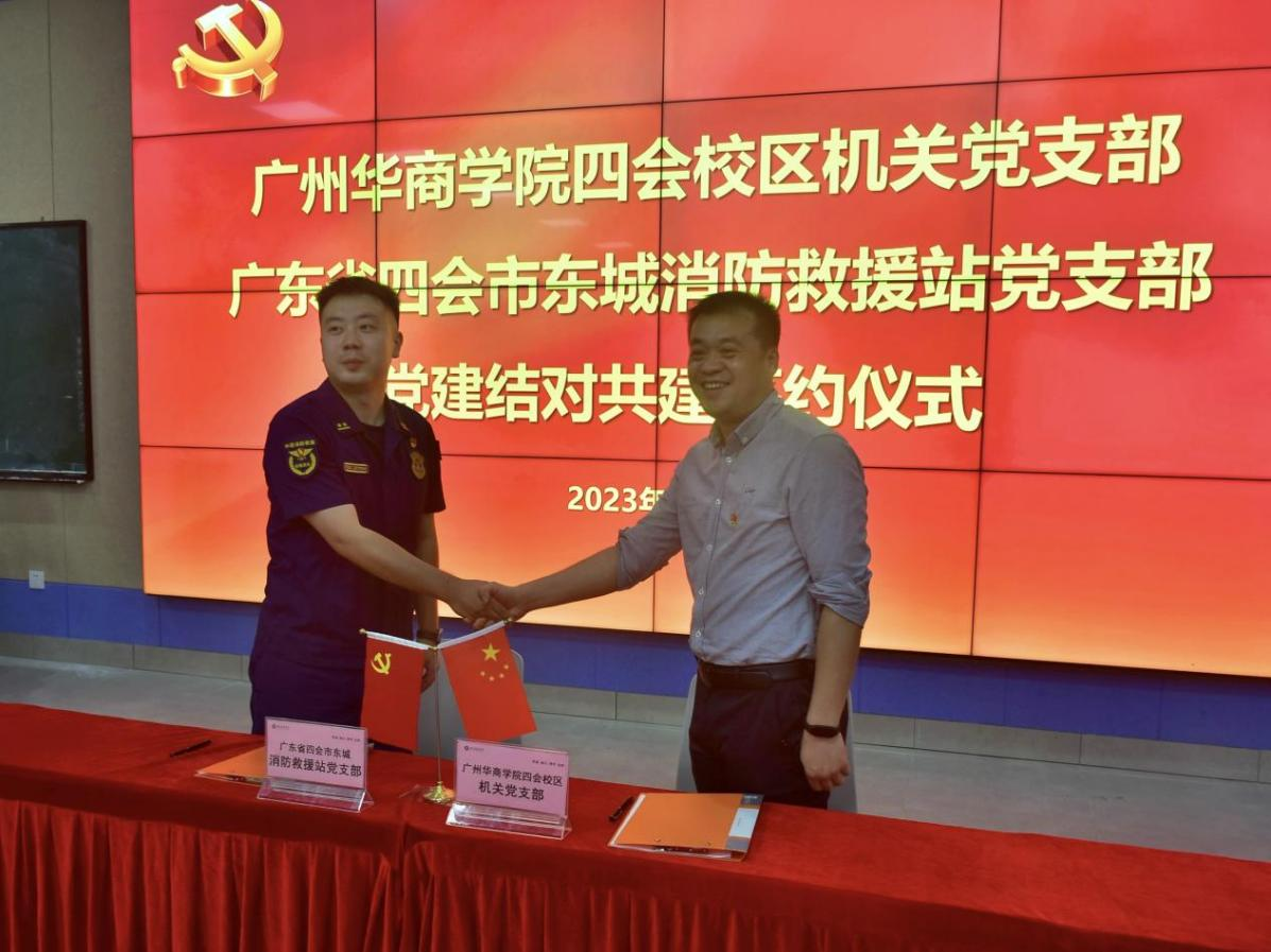 党建共建聚合力,结对互助促发展。为深入推进学习贯彻习近平新时代中国特色社会主义思想主题教育,2023年6月1日下午,在学校党委的指导下,四会校区机关党支部与四会市东城消防救援站党支部举行党建结对共建签约仪式。伟德体育四会校区党委书记王卫平、副书记覃少冰、委员付蔚莹、段晓聪、江庆基,四会市东城消防救援站党支部书记宋思岐、教导员龚鑫、副站长陈澧平等领导出席本次活动,四会校区各党支部书记、支委、各支部党员代表、四会市消防救援大队指战员代表共同参加本次活动。