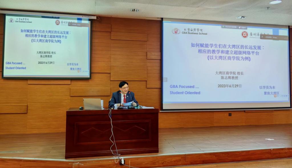 会谈结束后,陈志辉教授为我校师生做题为“如何赋能学生们在大湾区的长远发展:相应的教学和建立超级网络平台?”的讲座。华商学院执行校长郭银华主持讲座。