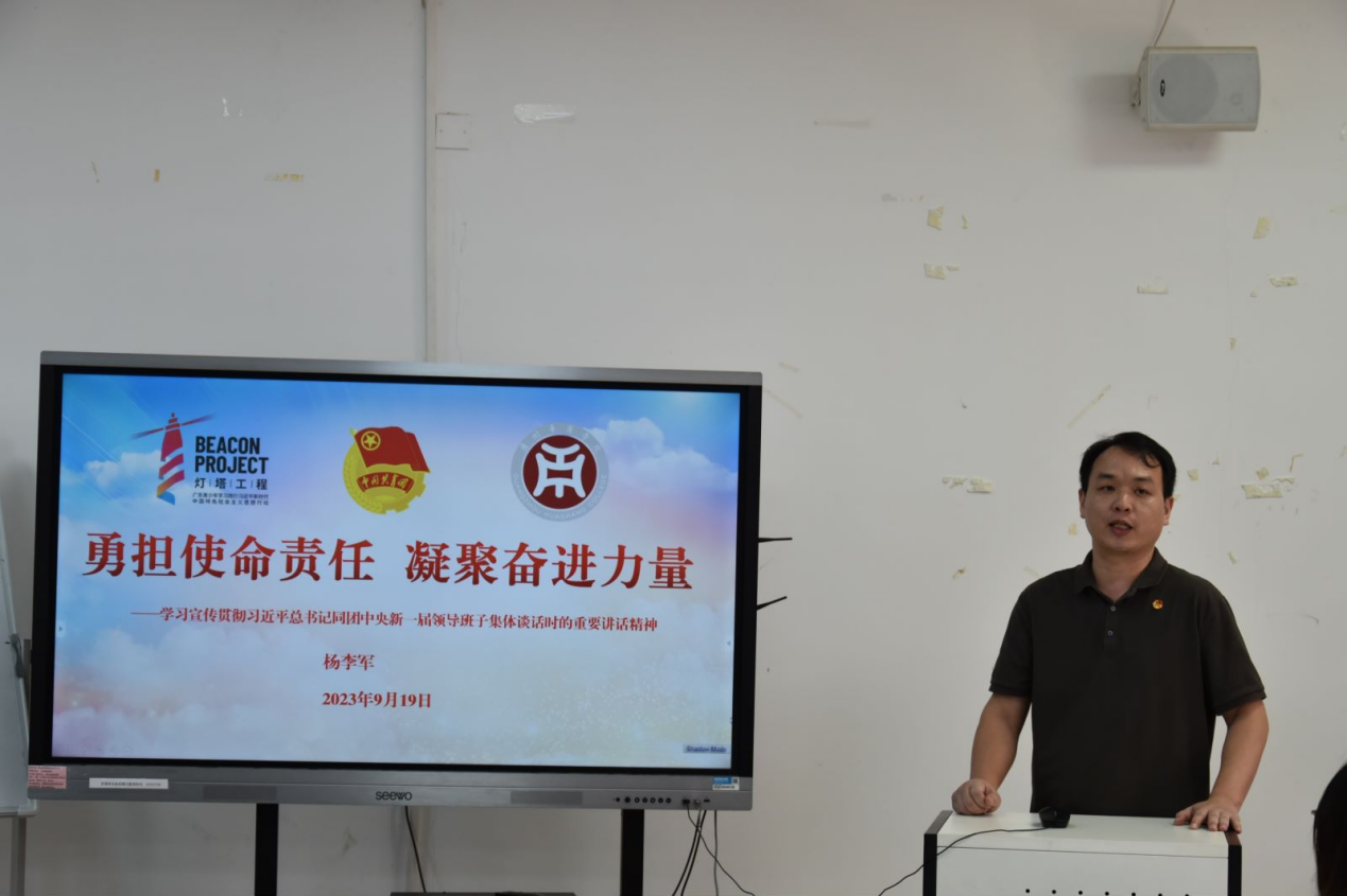 教师教育学院团委书记邓奎、团委副书记杜范、学生会指导老师徐炯锋分别于9月7日和9月9日在增城校区励志楼B207和四会校区8号楼109召开集体学习会。与会人员集体学习了习近平同团中央新一届领导班子成员集体谈话时的重要讲话以及蔡奇代表党中央发表的题为《在强国建设民族复兴新征程上书写壮丽青春篇章》的致词。三位老师在传达学习中指出,习近平总书记在同团中央新一届领导班子集体谈话时强调,“共青团要把牢新时代青年工作的主题,最广泛地把青年团结起来、组织起来、动员起来”。作为新时代青年学生骨干要积极作为,既要深刻认识党中央对青年的殷切期盼,更要担起当代青年的时代责任,进而主动投身到团结、组织、动员青年同学的生动实践中去,凝聚在校青年,激发属于青春的强国激情与热血。