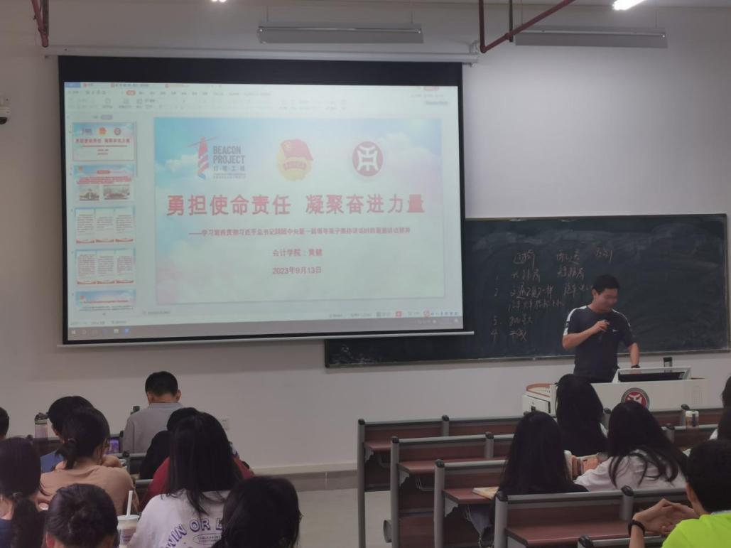 9月19日,国际学院团委在启智楼405教室开展“勇担使命责任,凝聚奋进力量”主题团课,本次团课由国际学院团委书记杨李军老师主讲。旨在激发青年学生的担当精神,为实现中华民族伟大复兴贡献力量。此次团课活动主要围绕学习贯彻习近平总书记同团中央新一届领导班子成员集体谈话时发表的重要讲话精神。通过讲解、分析、现场问答等形式,引导青年团员深入思考如何在实际工作中践行使命,如何更好地发挥个人优势,如何为团队贡献力量。杨书记用生动的语言、具体的案例和实践经验,阐述了使命责任的重要性。同时,结合国际学院实际情况和未来发展方向,强调了团队协作、创新创业、担当精神等方面的关键作用。他还鼓励青年团员要勇于担当责任,积极探索创新,不断提升自身素质和能力。