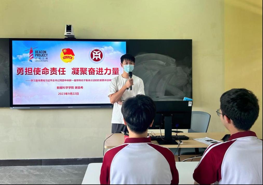数据科学学院团委书记谢嘉希、学生会指导老师王璐带领大家共同深入学习领会习近平总书记同团中央新一届领导班子成员集体谈话精神。团课中,谢书记强调作为学生团员青年,要坚定理想信念。要学深悟透习近平新时代中国特色社会主义思想,努力掌握这一科学思想的世界观和方法论,善于运用贯穿其中的立场观点方法分析问题,在知行合一、学以致用上下功夫,保持守初心的定力。团委副书记王怡时在四会校区带领学生团员学习习近平总书记在同团中央新一届领导班子集体谈话时的重要讲话精神以及团的十九大精神。他呼吁大家要加强自身建设,发挥好模范带头作用,推动共青团事业和青年工作实现新的更大发展。必须紧紧围绕党的二十大确定新时代新征程党的中心任务来开展工作,把握方向,奋发有为。