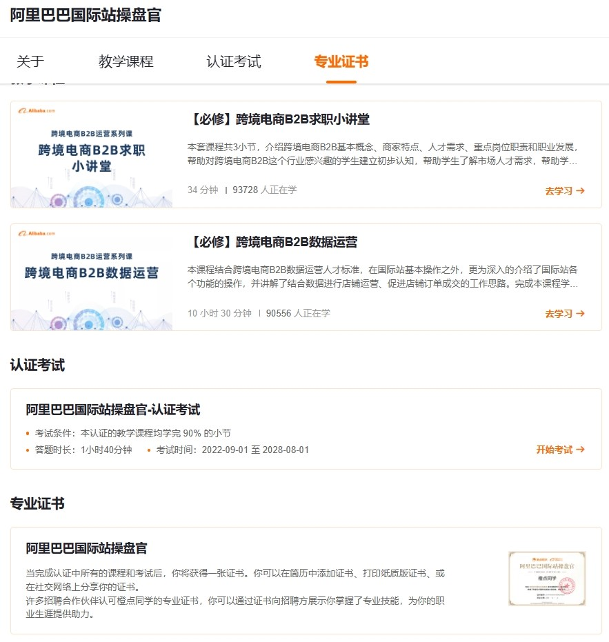 阿里巴巴国际站为伟德体育学生提供“阿里巴巴国际站运营操盘官”和“跨境电商B2B数据运营职业技能等级证书”系列课程学习、实训和认证。