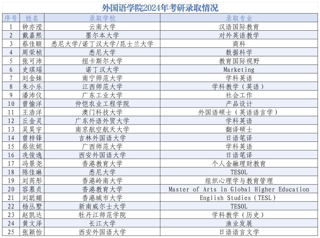 2024年,外国语学院学子考研再创佳绩。截止目前,共有25名同学脱颖而出,分别被广东外语外贸大学、广东工业大学、云南大学、南京航空航天大学、西安外国语大学、香港教育大学、悉尼大学等境内外知名学校录取。此次优异的成绩,既是外国语学院不断提高教学质量、注重内涵建设的成效,也是学子们努力奋斗、坚持不懈的成果。