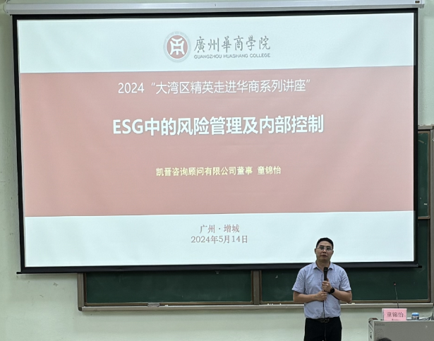 2024年5月14日,大湾区精英走进华商系列讲座(第六场)暨管院大讲堂-启智系列讲座(第四场)在广州校区励志楼D208举行。讲座主题为“ESG中的风险管理及内部控制”,特邀香港凯晋管理咨询有限公司董事童锦怡女士作为主讲嘉宾。讲座围绕企业风险管理系统–COSO框架的元素及其应用、企业风险管理与内部控制的关系等方面进行了深入探讨。