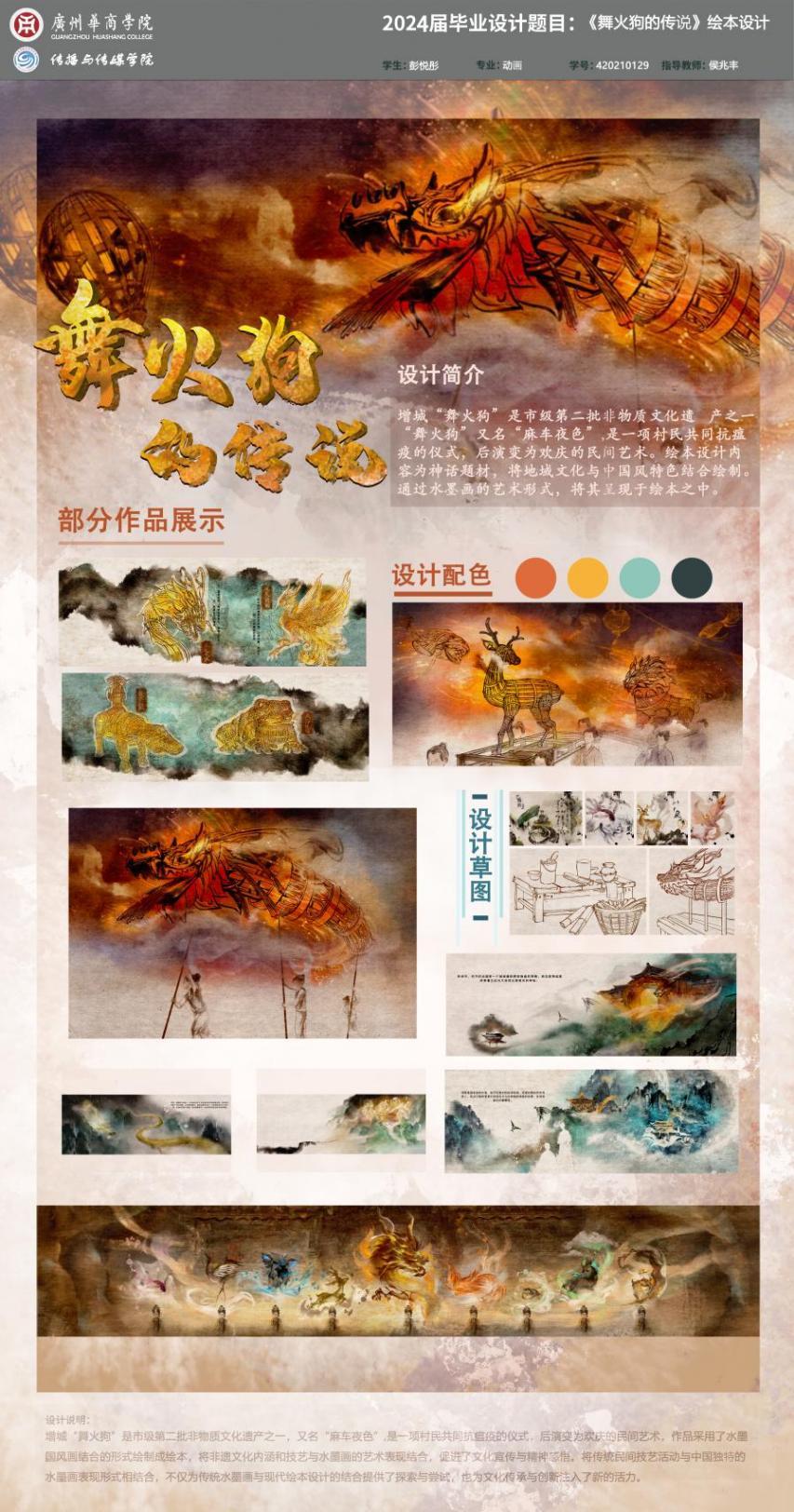 设计阐述:增城“舞火狗”是市级第二批非物质文化遗产之一,又名“麻车夜色”,是一项村民共同抗瘟疫的仪式,后演变为欢庆的民间艺术,作品采用了水墨国风画结合的形式绘制成绘本,将非遗文化内涵和技艺与水墨画的艺术表现结合,促进了文化宣传与精神感悟。将传统民间技艺活动与中国独特的水墨画表现形式相结合,不仅为传统水墨画与现代绘本设计的结合提供了探索与尝试,也为文化传承与创新注入了新的活力。