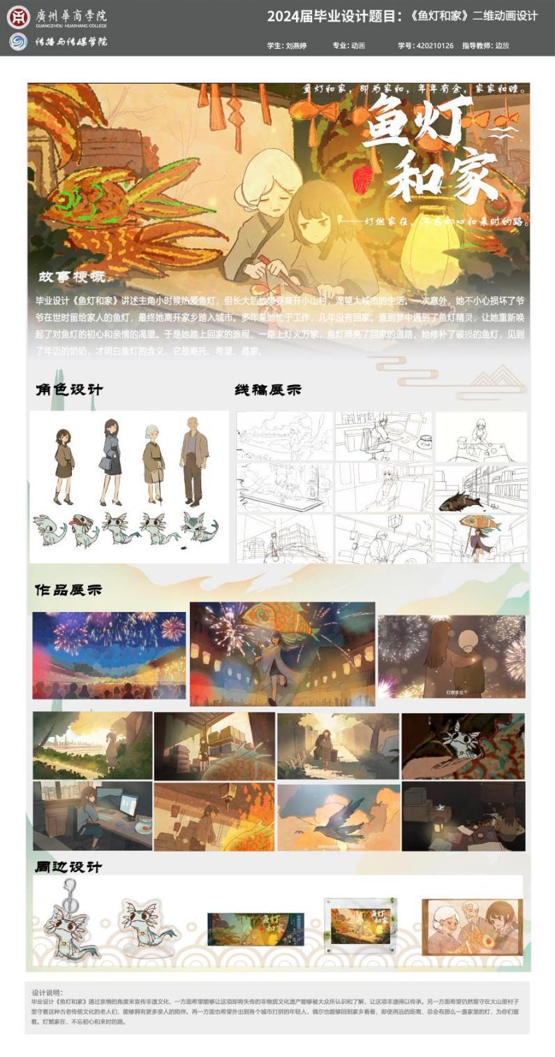 设计阐述:毕业设计《鱼灯和家》通过亲情的角度来宣传非遗文化,一方面希望能够让这项即将失传的非物质文化遗产能够被大众所认识和了解,让这项非遗得以传承。另一方面希望仍然留守在大山里村子里守着这种古老传统文化的老人们,能够拥有更多亲人的陪伴。再一方面也希望外出到各个城市打拼的年轻人,偶尔也能够回到家乡看看,即使再远的距离,总会有那么一盏家里的灯,为你们留着。灯燃家在,不忘初心和来时的路